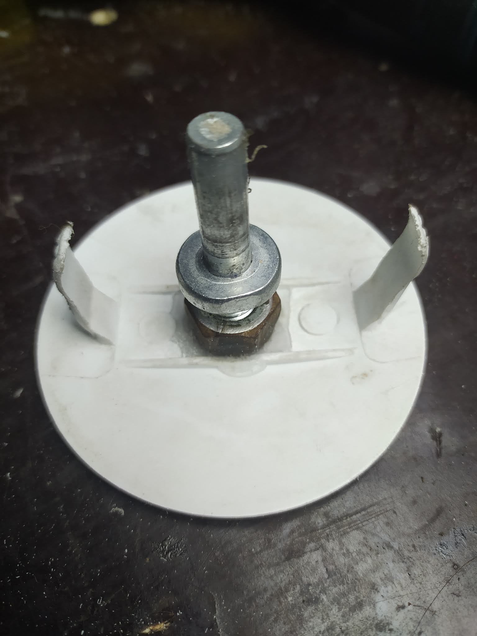 Zımpara yapıyorum bir taraf fazla gidiyor diğer taraf az, elips olmaya doğru yaklaşmışken gözüme rafta cırtlı taban takıldı, hemen bir somun buldum buatın göbeğine yapıştırdım, onu da taktım vidalamanın ucuna döndüre döndüre zımpara marifetiyle istediğim ölçüye getirdim.