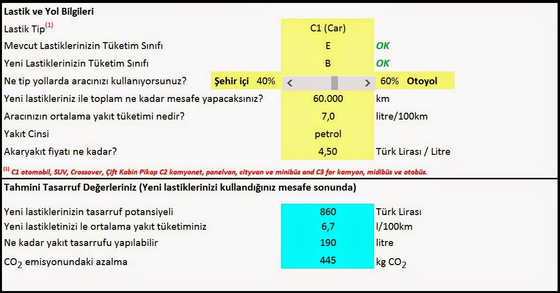 İki farklı tip lastiğin karşılaştırması ve tüketim hesaplama programı ile konu daha rahat anlaşılabilir.